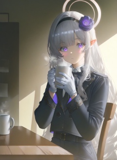 masterpiece, best quality, high quality, extremely detailed CG unity 8k wallpaper, extremely detailed, High Detail, vibrant colors, anime style, cover art,masterpiece,best quality,good quality,newest,very aesthetic,absurdres,Visual impact,32K UHD,sharp focus,(mogumo:1.1),(good hands, nice hands:0.5),impactful picture,offcial art, masterpiece,absurdres,newest,masterpiece,best quality,extremely detailed,(illustration, official art:1.1),cowboy shot, 1girl, solo, long hair, looking at viewer, blush, bangs, hair ornament, gloves, long sleeves, holding, sitting, purple eyes, jacket, flower, white hair, hairband, pointy ears, white gloves, hair flower, mole, cup, mole under eye, halo, black hairband, steam, holding cup, mug, coffee
