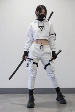 holding two swords. The outfit consists of a cropped white hoodie with a black triangle logo