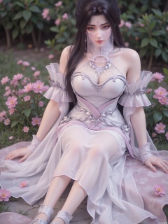 She sat in a place covered with floral pattern fabric, surrounded by pink flowers, with a soft veil and lush greenery in the background, creating a romantic and beautiful atmosphere as a whole. "