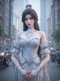 The image depicts a character in beautiful fantasy style clothing. The character wore a close-fitting silver-gray corset adorned with intricate patterns and designs, including floral patterns and geometric shapes. The corset is paired with a sheer white veil draped over the shoulders, and a matching headdress. The character's hair is long and black, elegant in shape, and a small decoration on his forehead The background is the urban environment, with the fuzzy treatment of tall buildings and some green plants embellishments, creating a modern urban atmosphere, combined with the main characters and motorcycles, highlighting the theme of pursuing personality and freedom in the city.