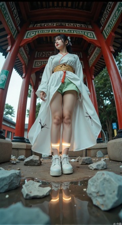 (Shattered porcelain fragments:1.4) clinging to shoe bottom treads (Collapsing pagoda pillars:1.3) reflecting in polished shoe bottom (Quantum yin - yang vortex:1.4) mirrored on shoe bottom surface