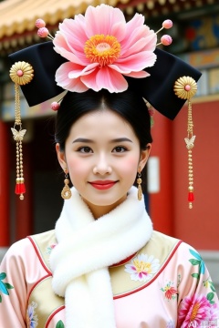 The woman in the picture is wearing Qing Dynasty princess costumes. The flag dress is rich in color, with light pink and beige as the main tones, and is covered with colorful floral patterns, full of agility. A white plush scarf is surrounded by a collar, which is soft and charming.