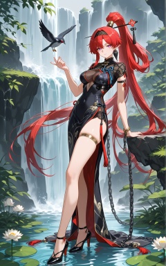masterpiece,bird,flower,waterfall,looking at viewer,alternate costume,best quality,absurdres,swept bangs,tassel,leaf,water,grey background,full body,standing,lily pad,holding,<lora:XL_ill_yinlin(wuthering waves)_v1:0.75>,yinlin\(wuthering waves\),1girl,solo,long hair,very long hair,ponytail,red hair,purple eyes,high heels,chain,china dress,dress,black dress,full body,