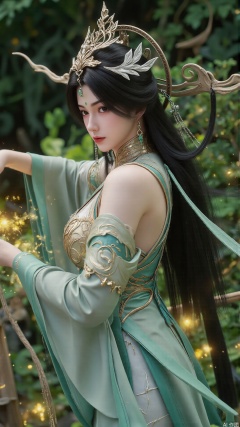 masterpiece,best quality,1girl, black hair, solo, dress, long hair, green dress, full body, jewelry, earrings, forehead mark, facial mark, hair ornament, looking at viewer, chinese clothes, hair rings, hagoromo, cowboy shot, dynamic pose, dynamic angle,