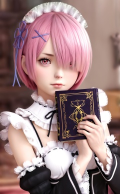 masterpiece,highres,newest,best quality,high quality,loli,petite,chromatic_aberration,//,loli,1girl,solo,pink hair,roswaal mansion maid uniform,short hair,ram (re:zero),maid,detached sleeves,hair over one eye,hair ornament,book,holding,looking at viewer,x hair ornament,ribbon,realistic,blurry,maid headdress,holding book,wide sleeves,blurry background,ribbon trim,lips,dress,frills,black ribbon,indoors,ribbon-trimmed sleeves,frilled sleeves,depth of field,lace-trimmed sleeves,hair ribbon,upper body,black dress,neck ribbon,long sleeves,apron,closed mouth,lace trim,blue ribbon,detached collar,pink eyes,nose,ribbon-trimmed clothes,red eyes,//,year_2023,year_2024,//,