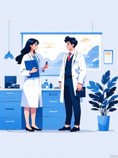 BPCH, Digital illustration of a modern office setting featuring a man and a woman in a professional conversation. The man, with short dark hair, wears a navy blue suit with a red tie and holds a clipboard. The woman, with long dark hair, wears a white lab coat and also holds a clipboard. They stand in front of a light blue desk with a potted plant and a few office supplies. The background includes abstract blue and white wall art and a window showing a stylized landscape. The style is clean and minimalistic with a flat color palette.