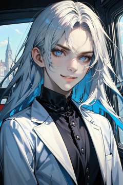 hezi,brilliant color,brush texture,beauty,a young man,With sculptural facial features,Dark blue eyes,silver hair,Her hair was slightly blown by the wind,handsome,good figure,tall and thin,Facing the camera face,Keep your eyes on the camera,anime style,Standing on the bus,smiling,passenger,upper body,(solo:1.8),<lora:纯彩﷿丽质感-000016:0.65>,