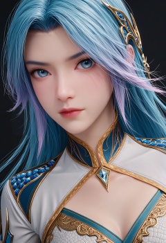 perfect_anatomy,score_9,(upper_body:1.1),looking_at_viewer,<lora:YQ_pony_wangqiuer_V3:0.8>,q1528437228,1girl,solo,long hair,blue hair,blue eyes,breasts,dress,hair ornament,realistic,white dress,lips,multicolored hair,perfect_anatomy BREAK perfect_anatomy,simple background,black background,(shiny_skin),(Ivory_skin:1.1),(cinematic lighting),