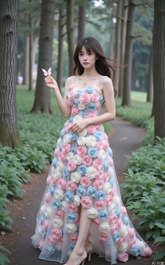 The image shows a young woman standing in a forest. She is wearing a long, flowing dress made up of pink and blue roses. The dress has a sweetheart neckline and thin straps. The skirt of the dress is full and flows down to the ground. The woman is holding a small pink butterfly in her hand. She has long dark hair styled in loose waves and is wearing high heels. The background is filled with tall trees and lush greenery. The overall mood of the image is dreamy and ethereal.