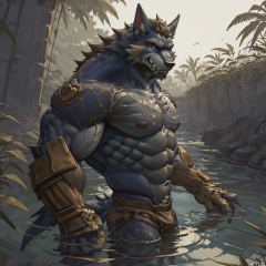 solo, looking at viewer, smile, short hair, 1boy, navel, animal ears, nipples, tail, male focus, water, stomach, from side, wet, muscular, bird, abs, wolf ears, pectorals, muscular male, bara, furry, partially submerged, large pectorals, topless male, furry male,wolf boy, character:warwick