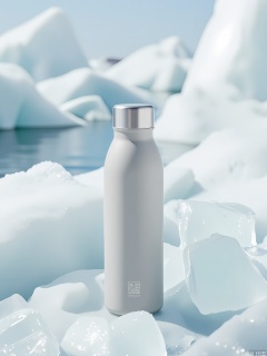 BKCJ, A high-quality, high-resolution photograph of a sleek, stainless steel coffee thermos with a vacuum-insulated design, sitting upright amidst a bed of crushed ice. The thermos features a matte finish and a push-button lid, with a minimalist logo on the side. The background showcases a frosty, glacial scene with ice formations and a pale blue hue, creating a crisp, refreshing ambiance. The lighting is soft, casting gentle shadows that accentuate the thermos's elegant curves. The thermos is placed slightly off-center, surrounded by glistening ice shards.