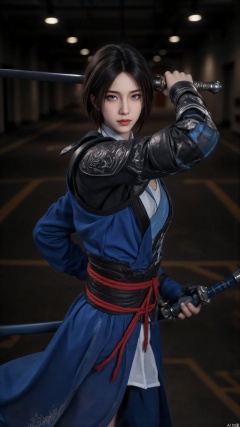 Wearing a set of martial - arts - style clothing in blue, black, and red colors. The blue upper garment is paired with black armor and decorations, and a red rope belt is tied around the waist. The lower garment is in the form of a blue skirt. The overall clothing not only reflects the characteristics of traditional martial - arts costumes but also incorporates modern design elements, highlighting the character's neatness and capability.