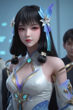 Close-up details,realistic style photo outstanding style,tall,cute,in her teens. Use soft lighting to cast gentle shadows on the subject,adding a touch of dimension to your images without compromising details,score_9,score_8_up,score_7_up,looking at viewer,<lora:定制-云落-海神装Pony:0.7>,straight black hair adorned with intricate blue and white ribbons,white,form-fitting gown,dress,