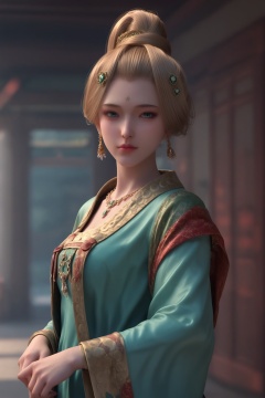 realistic style photo outstanding style,tall,cute,in her teens. Use soft lighting to cast gentle shadows on the subject,adding a touch of dimension to your images without compromising details,score_9,score_8_up,score_7_up,looking at viewer,upper body,<lora:长歌行-李瑾Pony:0.7>,blonde hair styled in a high,elegant updo adorned with a small,golden hairpin. wears a traditional,ornate necklace with a large,green gem and a smaller blue gem,and matching earrings with intricate designs. Her attire is a flowing,light blue robe with intricate gold trim,and a red,gold-patterned cloth draped over her shoulder.,dressed in a traditional,flowing green robe with intricate gold embroidery along the sleeves and hem. A vibrant red shawl with a geometric pattern is draped over her shoulders,