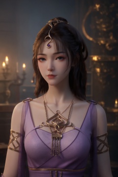 realistic style photo outstanding style,tall,cute,in her teens. Use soft lighting to cast gentle shadows on the subject,adding a touch of dimension to your images without compromising details,score_9,score_8_up,score_7_up,looking at viewer,upper body,<lora:凡人修仙传-文思月Pony-重制版:0.7>,black hair,small,intricate headdress,dressed in a form-fitting,royal purple gown with gold accents,including intricate,gold arm cuffs and a gold belt with a prominent pendant.,
