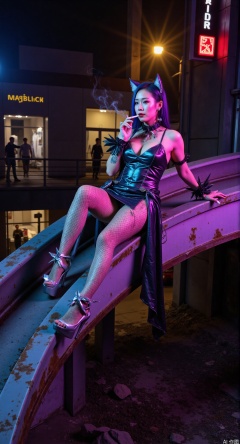 "Dutch-angle tableau of a neon-noir siren lounging across the Art Deco curves of a corroded monorail beam. Her serpentine body forms a liquid Z-shape against rusted steel, fishnet-stocking legs extended in parallel defiance of perspective. A cigarette holder of blackened titanium angles from her lips, its holographic smoke coiling around a face framed by a geometric wolf-cut dyed in quantum chroma shifts. Sheathed in a liquid mercury trench dress with collapsing collar architecture, the garment's morphic surface reflects both decaying urban skyline and pulsating AR advertisements. Chrome-talon fingertips trace the braille inscriptions on a crystalline data cube, while her augmented iris projects scrolling lines of forbidden code into the humid night air. The scene pulses with contradictory light sources - sickly yellow streetlamps battling violet neon from noodle shop signs, all underlit by the radioactive glow of mutant kudzu vines consuming the elevated tracks. Extreme focus on refractive material textures, the tension between biomechanical prosthetics and decaying infrastructure, and the chromatic aberration of near-future pollution haze."