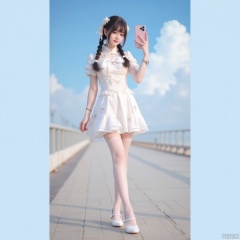 1girl, solo, long hair, black hair, dress, ribbon, holding, twintails, full body, braid, short sleeves, outdoors, sky, day, cloud, white dress, high heels, twin braids, blue sky, chinese clothes, phone, white footwear, crossed legs, cellphone, china dress, smartphone, holding phone, selfie, photo background, photo inset