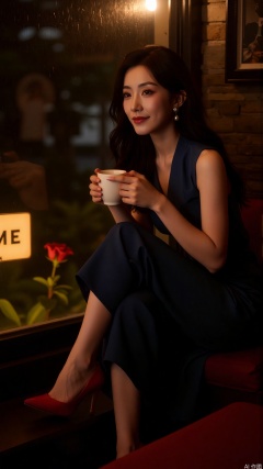 rainy,vivid color photo background,An elegant woman with a beautiful face, wearing a dark blue dress and red high heels, sits by the window of a café on a rainy night, holding a cup of hot coffee. Shot with a Sony A7C camera, aperture f/2.8, shutter speed 1/80 second, ISO 500, with a warm color tone as the main, creating a cozy and romantic atmosphere.,lzbg,zhj