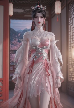Liu_mei,1girl,bare legs,black hair,hair ornament,jewelry,hair bun,earrings,blurry background,mole under eye,makeup,hair bun,dress,white dress,pink dress,chinese clothes,see-through,long sleeves,clothing cutout,anklet,pink footwear,red footwear,red hair ribbon,photorealistic,hyperrealistic,<lora:realistic filter [IL]:1>,(pale skin),looking at viewer,standing,(upper body:1.2),close up,head shot,lantern,open window,looking at viewer,indoors,mountains,blossoms,flowers,east asian architecture,beautiful sunrise,warm ambient temperature,<lora:Liu_mei_10_illu-000005:0.75>,