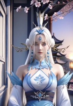 Donghuang_taixin,1girl,hair ornament,white hair,long hair,earrings,jewelry,bare shoulders,bare legs,blurry background,gem,circlet,hair stick,<lora:Donghuang_taixin_10_illu-000005:0.75>,dress,white dress,blue dress,detached sleeves,sash,chinese clothes,wide sleeves,ribbon,photorealistic,hyperrealistic,<lora:realistic filter [IL]:1>,(pale skin:1.1),looking at viewer,standing,(upper body:1.5),close up,head shot,lantern,open window,looking at viewer,indoors,mountains,blossoms,flowers,east asian architecture,beautiful sunrise,warm ambient temperature,