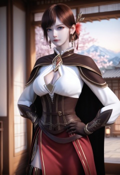 He_di,1girl,brown hair,earrings,hair ornament,jewelry,cleavage,blue eyes,blurry background,short hair,corset,cowboy shot,bangs,<lora:He_di_10_illu-000006:0.75>,cape,gloves,high heels,brown footwear,skirt,thigh boots,long sleeves,red skirt,side slit,clothing cutout,cleavage cutout,photorealistic,hyperrealistic,<lora:realistic filter [IL]:1>,(pale skin:0.7),looking at viewer,standing,one hand on hip,lantern,open window,looking at viewer,indoors,mountains,blossoms,flowers,east asian architecture,beautiful sunrise,warm ambient temperature,