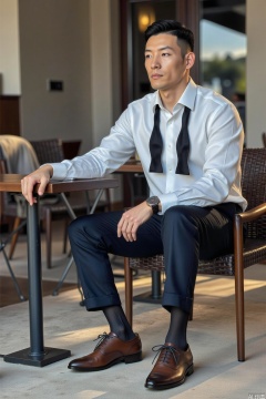 The man is wearing a white shirt, a loose black bowtie, dark trousers and leather shoes, along with black sheer socks. brown leather shoes. Sitting in cafe, outdoors,he holds the railing with one hand and rests the other on his leg, with a composed look...jzns,brn,xnz,formal,watch,motion blur effect