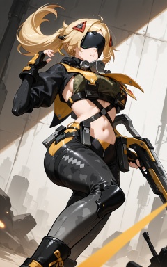 <lora:xl-ill-trigger(zenless zone zero)-v1-000010:0.8>,trigger\(zenless zone zero\),1girl,solo,blonde hair,ponytail,blindfold,covered eyes,breasts,jacket,black jacket,gloves,navel,orange gloves,fingerless gloves,cropped jacket,camouflage,boots,black footwear,weapon,gun,rifle,science fiction,