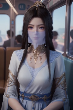 solo,1girl,solo focus,(perfect_anatomy:1.1),(upper_body:1.2),(portrait:1.1),sitting,(train_interior:1.1),(blurry_background:1.2),score_9,<lora:凡人-紫灵结丹初期:0.7>,long,straight black hair,a light blue gown with intricate golden details,high collar,long sleeves,golden belt,white cloth mask,