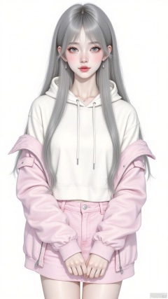 This illustration depicts a young female character with long gray-black hair, a slightly messy hairstyle with a hint of unruly fashion. She was wearing a white hoodie and a light pink jacket on the outside, and the overall style was casual and fashionable. The overall tone is soft, giving people a warm and comfortable feeling.