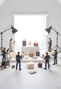 WSCJ, Photograph of a miniature e-commerce photography studio with tiny figurines of photographers adjusting lights and cameras around a product shoot. The figurines are posed in dynamic ways, showing the behind-the-scenes action. The background is a clean white, with subtle shadows adding depth. The products on display are meticulously arranged, catching the light perfectly. The lighting is bright and focused, highlighting the details of the products. The composition is professional and polished, reflecting the importance of product presentation.