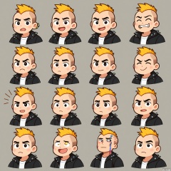 JSBQ, A collection of digital illustrations of a young man with a mohawk and a rebellious expression, wearing a punk rock jacket. He is portrayed in nine different expressions and poses, embodying emotions like defiance, passion, and individuality. The background is a plain white, enhancing the edginess of his look. The art style is punk-inspired, with bold colors and angular lines. His jacket is always covered in patches and pins in each illustration, showcasing his unique style. The overall mood is bold and unapologetic.