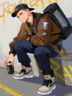 1boy (adjusted for gender), gold eyes, mohawk with undercut designs, solo, confident smirk, snapback hat backwards, short hair, duffel bag with graffiti, forward gaze, layered chains, bomber jacket and joggers, parted lips, studded belt, holding spray paint can, urban mural sketches, gray concrete background, chunky sneakers