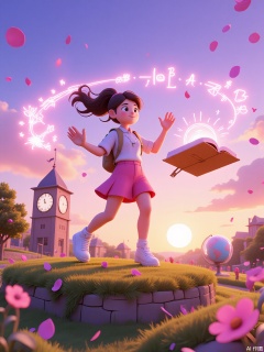 QNJ, 3D artwork featuring a young woman levitating above a grassy hill, physics textbook suspended beside her, glowing periodic table elements swirling around outstretched hands, neon campus clocktower pulsing in the distance, dusk sky blending peach and lavender hues, confetti-like equations dissolving into stardust, determined gaze upward, wind tousling hair, translucent holographic globe rotating at her feet.