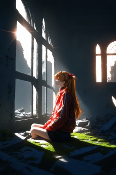 masterpiece,best quality,amazing quality,very aesthetic,absurdres,newest,highres,knva,retro artstyle,bloom,high contrast,detailed texture,souryuu asuka langley,1girl,solo,low light,jacket,upper body,rubble_ruins,moss,window,the sun shines through the window,ray tracing,from side,sitting on the ground by the window,
