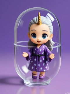 SBJN, Photo of a small figurine of a unicorn with a silver mane and a golden horn, wearing a flowing purple robe with star patterns. The figurine is held in a clear glass capsule by a hand, with a dark purple background. The unicorn has a serene expression, with large blue eyes and a gentle smile. The lighting is soft and even, highlighting the details of the figurine. The style is realistic, with a focus on the details and textures of the figurine and the glass capsule.