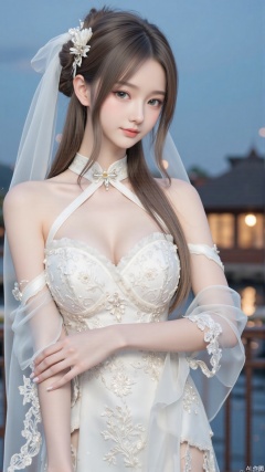1girl, white wedding dress,looking at viewer, mischevious smile, perfect body, scenery, sharp focus, best quality, masterpiece, detailed outfit, illustration, perfect eyes, finely detailed beautiful anime eyes, realistic skin, intricate details, best lighting, depth of field, ultra high resolution, cowboy_shot, bride