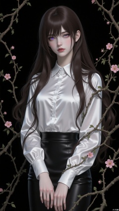 A white silk shirt, long dark brown wavy hair, a black pencil skirt. It's in the style of CG anime thick painting. The hair strands are glossy. The background is pure black. Flower branches and vines are twining. The character looks down at the camera from a superior position. It has a low-saturation color scheme, giving an air of gloom and decadence. It's a full-body portrait, in the style of CG anime thick painting, lifelike, extremely clear, in HD quality. It has a 3D stereoscopic effect. Exquisitely detailed eyes with colored contact lenses. A clean face. Delicate skin. Exquisite hands. Bangs and stray hairs covering the eyes. It has a semi-realistic style. Heterochromatic eyes.