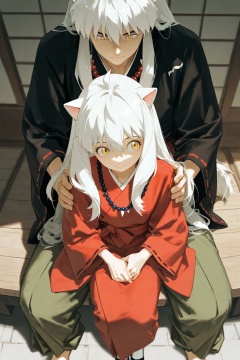 masterpiece,best quality,amazing quality,very aesthetic,absurdres,newest,highres,(dino_(dinoartforame):0.5),(yoneyama mai:0.5),inuyasha \(character\),inuyasha,solo,fortitude expression,1boy,dog ears,yellow eyes,hair between eyes,long hair,white hair,very long hair,red kimono,wide sleeves,long sleeves,bead necklace,1girl,anya \(spy x family\),spy x family,from_above,take a walk,kind_smile,girl sitting on boy's shoulders,