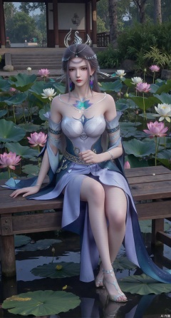 (masterpiece:1.2),best quality,The image is a digital illustration of a young woman sitting on a wooden bench in a pond with lily pads. She is wearing a long dress with design on the chest and sleeves. The dress has a high neckline and short sleeves,Holding a lotus in hand. She has long dark hair styled in loose waves and is wearing gold high heels. The woman is posing with one hand on her hip and the other resting on the edge of the bench. The background is filled with pink and white lotus flowers and green leaves. The overall mood of the image is peaceful and serene,(huge breasts:2.99),(full breasts:2.99),(Background with traditional Chinese architecture, lotus pond and pink lotus flowers:1.39),XyunyunXY,Xmeining,Xjiangziyue,Xweinina,Xyunxiao,Xxiaoqingxue,Xlenhuan