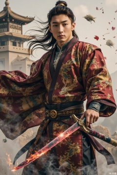 A muscular mysterious blade master dressed in a Western Regions brocade robe with interlaced patterns, where the embroidered nine-colored divine deer shimmers in spiritual light. He holds a Yanling Dao inlaid with Hetian jade, and the blade reflects the blood-red setting sun. Beneath his feet floats an aerial pavilion holding Dunhuang scriptures. The contrast between the cold sandy gray and the blazing Buddhist gold tells the thousand-year legend of Silk Road treasures...jzns,wak,double-exposure