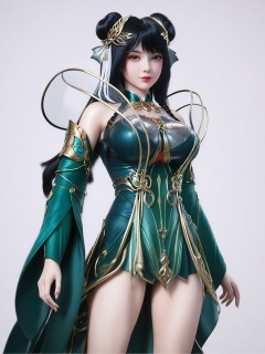 score_9,<lora:SF_HangFuLing2_Pony_Realism2.3-000004:0.7>,1girl,breasts,large breasts,standing,hair ornament,solo,lipstick,black hair,dress,jewelry,detached sleeves,green dress,double bun,skirt,cowboy shot,bare legs,looking at viewer,white background,simple background,