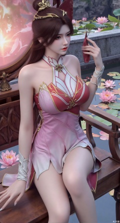 (masterpiece:1.2),best quality,The image is a digital illustration of a young woman sitting on a wooden bench in a pond with lily pads. She is wearing a long dress with design on the chest and sleeves. The dress has a high neckline and short sleeves,Holding a lotus in hand. She has long dark hair styled in loose waves and is wearing gold high heels. The woman is posing with one hand on her hip and the other resting on the edge of the bench. The background is filled with pink and white lotus flowers and green leaves. The overall mood of the image is peaceful and serene,(huge breasts:2.99),(full breasts:2.99),(Background with traditional Chinese architecture, lotus pond and pink lotus flowers:1.39),,Xanmiaoyi,Xyunwangshu,XlishaoyinY,Xbaixue,XanmiaoyiY,Xxiuqiuhua,XbaiyuerongY,XyunyunX,XqingnvzongZM,Xjuzi,Xshangguanweier,XanmiaoyiXY,XyunyunXY,Xjiangziyue,Xmeining,Xweinina,Xlenhuan,Xbabata,Xhuajin,Xjiangbilan,XbaihehuaiX