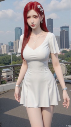 1girl, red hair, long hair, white dress, mischevious smile, perfect body, scenery, sharp focus, best quality, masterpiece, detailed outfit, illustration, perfect eyes, finely detailed beautiful anime eyes, realistic skin, intricate details, best lighting, depth of field, ultra high resolution, cowboy shot