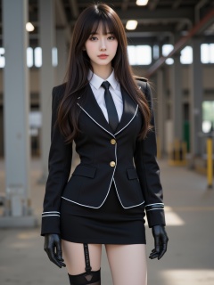 <lora:ca193f:1>,A young and beautiful woman with delicate facial features and tall figure, wearing a very stylish outfit: the main body is a black uniform, decorated with white lines to outline the outline, adding a sense of exquisiteness, and golden buttons embellish it, highlighting gorgeousness; a white shirt and a black tie, which is a classic combination. A black short skirt is paired with a black dress, showing playfulness and sexy; a black stockings are used to modify the leg lines and add a touch of charm; black high heels are under the feet to enhance temperament and aura; black gloves are also worn, and the overall shape is neat and elegant, and it looks cool and cool with an industrial background.