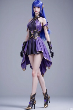 A woman with bright blue hair. She wears an exquisite golden hair accessory, with matching earrings. Dressed in a purple - and - gold halter - style dress, the upper part is a tight - fitting short style, adorned with golden lines to highlight her figure. The skirt is irregular, short on one side and long on the other. She wears black gloves on her arms, which are decorated with purple crystals and gold. She steps on black high - heeled short boots, with the boot surface embellished with golden lines and purple crystals. The overall look is both gorgeous and capable.