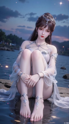 a serene and ethereal scene featuring a woman sitting by a body of water at dusk or dawn. She is dressed in a flowing, sheer garment adorned with star patterns, which complements the celestial theme of the image. Her long, dark hair is adorned with star-shaped accessories, enhancing the night sky motif. The woman's feet are prominently displayed, adorned with intricate star-shaped anklets and a dangling tassel, adding to the fantasy-like atmosphere. The water reflects the soft, glowing stars in the sky, creating a tranquil and dreamlike setting. The overall color palette is dominated by shades of blue and silver, contributing to the mystical and otherworldly feel of the scene.