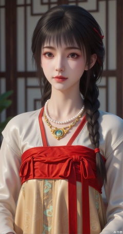 The image is a portrait of a young woman with long dark hair styled in a traditional Chinese dress. She is wearing a white blouse with a red ribbon tied around her waist and a gold necklace with pearls. Her hair is styled in two braids that are pulled back in a half-up, half-down style with bangs framing her face. She has a serious expression on her face and is looking directly at the camera. The background is blurred, but it appears to be a room with a wooden door and a plant. The overall mood of the image is elegant and regal.