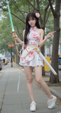 1girl, solo, long hair, skirt, black hair, hair ornament, brown eyes, jewelry, standing, full body, weapon, flower, outdoors, white sport shoes, belt, sword, hair flower, tree, glowing, chinese clothes, white footwear, realistic, glowing weapon, energy sword, glowing sword,golden legs chains,square