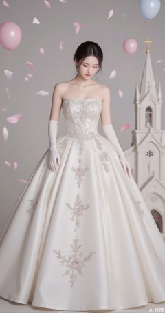 baoshi,lvjing,xiaomei,pifu,hunsha,1girl,dress,solo,gloves,black hair,elbow gloves,white dress,bare shoulders,white gloves,wedding dress,closed eyes,full body,long dress,grey background,strapless,standing,short hair,church,in the background is the 1 glorious church,a large number of petals and balloons flying in the air,simple background,gradient_background
