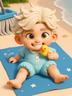 KTXX, 3D CGI illustration of a toddler boy with a mop of curly blond hair, dressed in a bright blue romper with white sailboat appliqués. He has a toothless grin and is clutching a rubber ducky in his left hand. The background is a calming seafoam green. The toddler is sitting on a beach towel, kicking his legs in delight. The style is reminiscent of modern, digital children's illustrations.